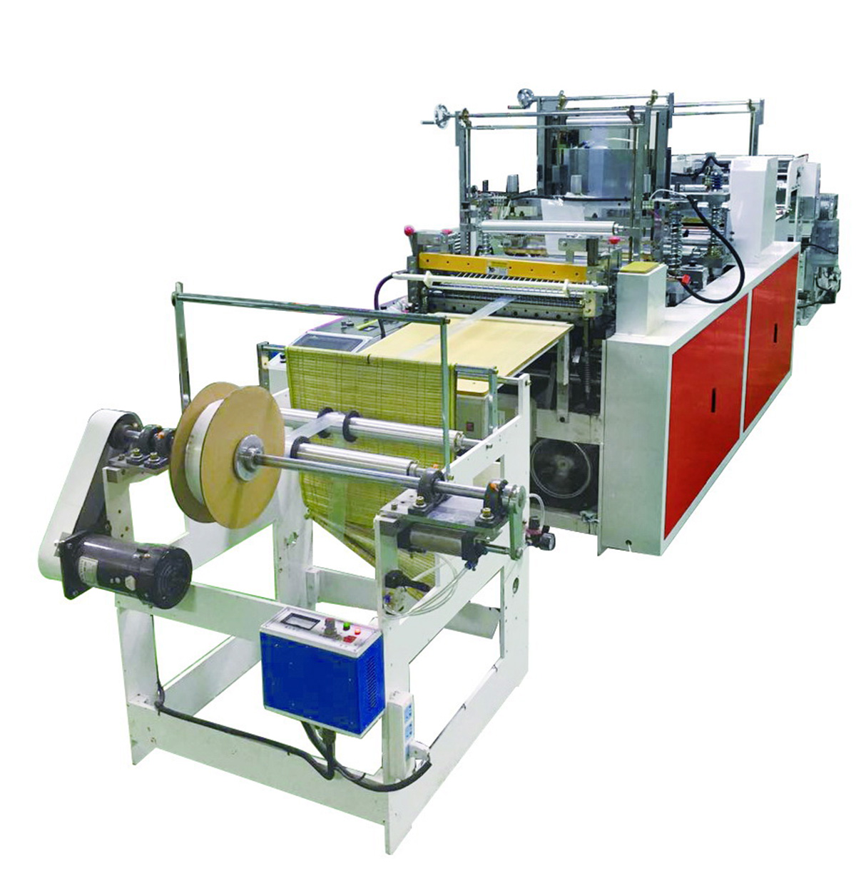 The Auto Packing Bag Making Machine is an ideal machine for producing various plastic flexible packaging such as white bags, color bags, flat pockets, vest bag garbage bags, etc.. It consists of a storage device, a stepping device, a frequency conversion device, a whole bag device, a heat sealing cutter and a control device.
