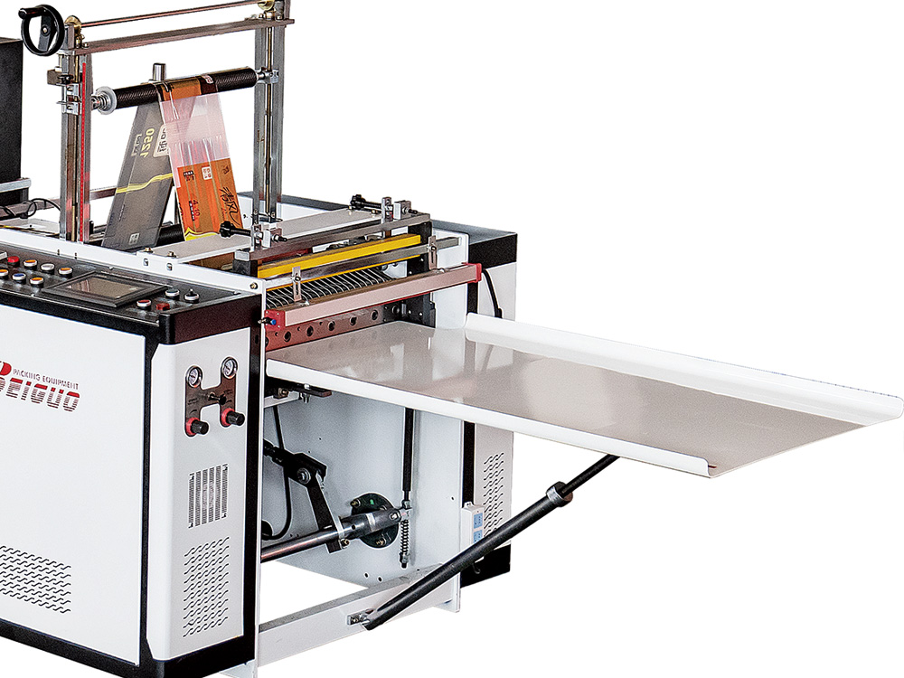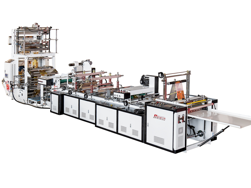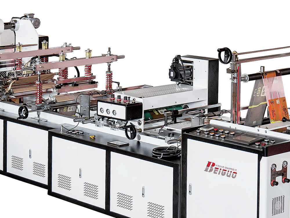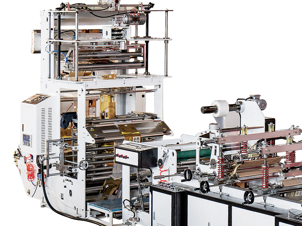 主要制作衛生紙外包裝、生活用品包裝袋的設備。雙插邊制袋一體完成。